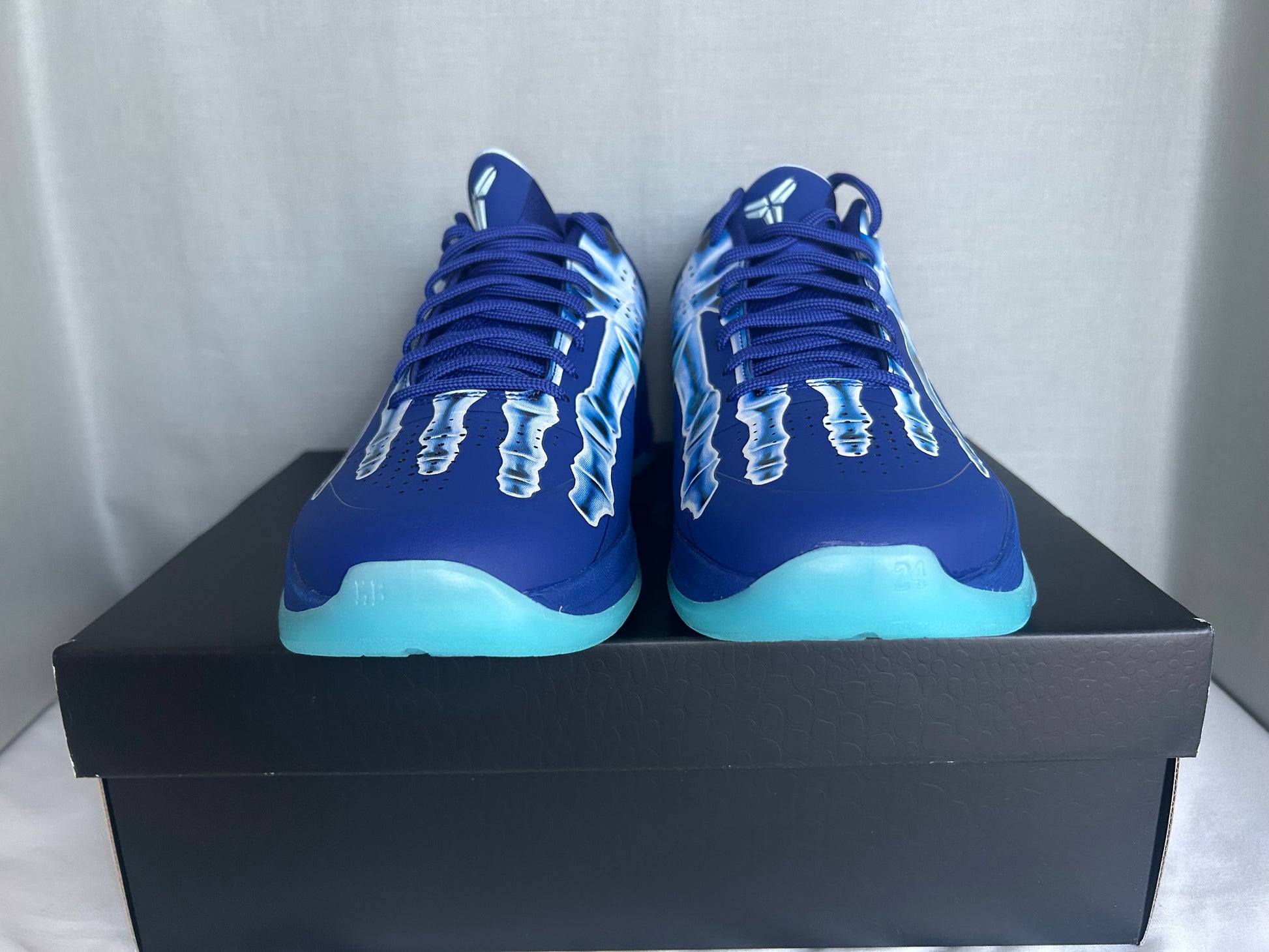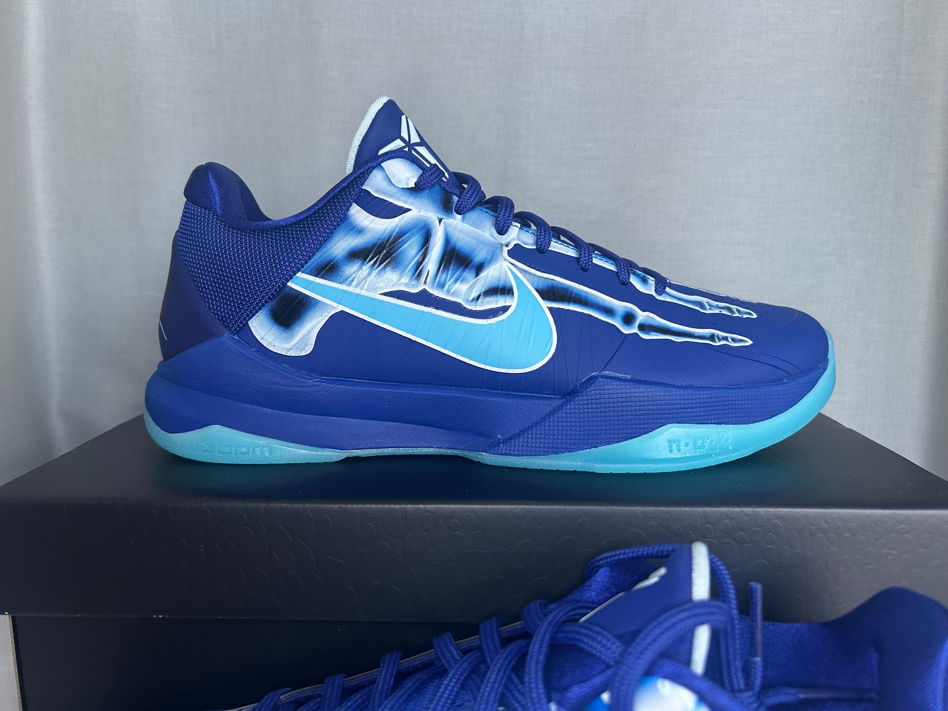 This rendition is inspired by the infamous t-shirt made by Nike that Kobe wore, which displayed an X-ray of his hand and showcased his five Championship rings. Paying tribute to Bryant’s legacy while also allowing everyone to remember how hard he battled on the court.The Nike Zoom Kobe 5 Protro 'X-Ray' sports a glow-in-the-dark X-ray graphic resembling the bones of the foot. A deep royal blue synthetic upper works with a padded mesh collar and integrated Flywire cables for lockdown. A lightweight Cushlon midsole contains a responsive Zoom Air forefoot unit, while a blue see-through rubber outsole glows in the dark.